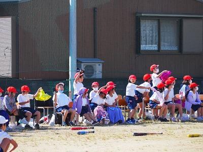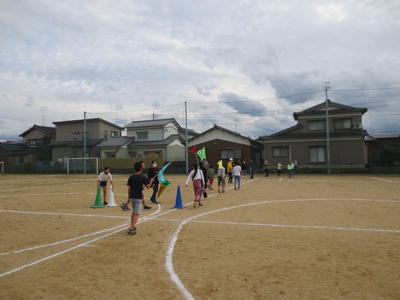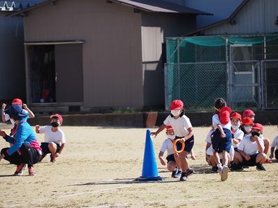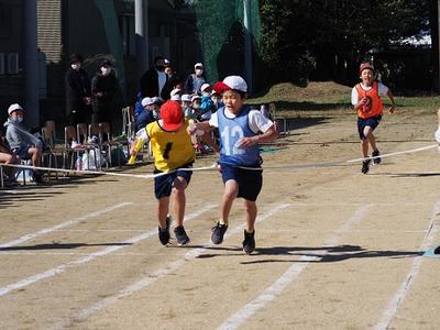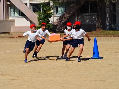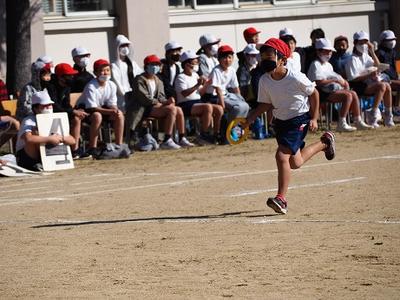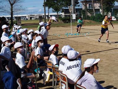 1,2年生は折り返しリレーです。距離は短いですが、コーンを折り返すところは、スピードの調整がなかなか難しそうです。どの子も、全力ダッシュ。転んでしまっても最後まで走りきりました。