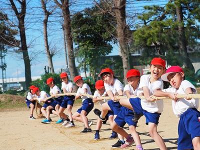 ポプラチームに分かれて綱引きをしました。結果は、一勝一敗で引き分けになりました。ぐぐっ、ぐぐっと勝負がついていく様は、とても迫力がありました。