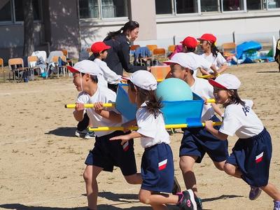ポプラチームでの対抗戦です。4人で協力してボールを運ぶリレーです。なかなか安定感のある入れ物なのですが、勢いがありすぎて傾いてしまうと、ボールが落ちてしまうことも。落ちたら、落ちた場所からやり直しです。4人のチームワークが試されます。