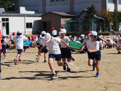 4人で協力してボールを運びます。高学年は、やっぱりすごいスピードでした。これが最後の競技です。優勝のゆくえがかかっているので、どのチームも必死で運びました。どのチームも本当にいい笑顔。