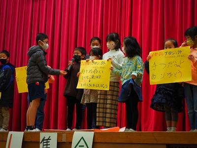 次に、各クラスで「なかよしプロジェクト」として、話し合いで決まった方法を発表しました。1年生から6年生まで、学級の代表の人が伝えてくれました。