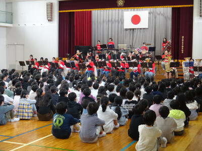 6年生にとっては、最後のコンサートです。全校児童を前にして、本年度練習してきた「校歌」「青と夏」「パプリカ」「さんぽ」「風の通り道」「ねこバス」「となりのトトロの」の7曲を演奏しました。各楽器の特色の紹介も入れながら、とても楽しく、素敵な演奏会になりました。