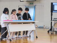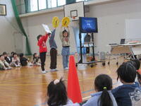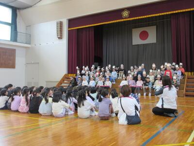 本校に入学予定の年長さんを招いて「新1年生を迎える会」を行いました。音読劇「たぬきの糸車」や1年生になってできるようになったことの発表をしました。鍵盤ハーモニカ、タブレットでの学習、音読、漢字、たし算・引き算、時計、縄跳び、マット運動、跳び箱・・・など、たくさんの発表がありました。全員での「もうじゅうがり」ゲームでは、3人組や4人組を作り、楽しく触れ合いました。
