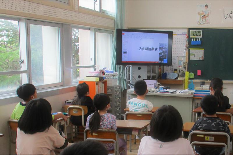 2学期の始業式は、コロナ感染拡大防止のため集合型とせず、パソコンで各教室をつないで「zoom(ズーム)」というテレビ会議のような方法で行いました。