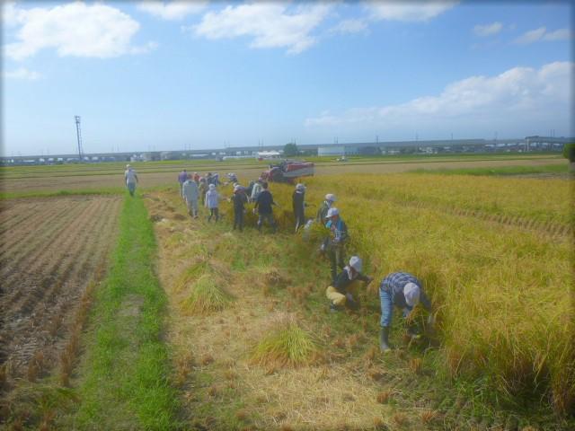 春は、泥の中で田植えをさせていただき、今回は、たわわに実った稲穂をおのおのが鎌で刈り取りました。