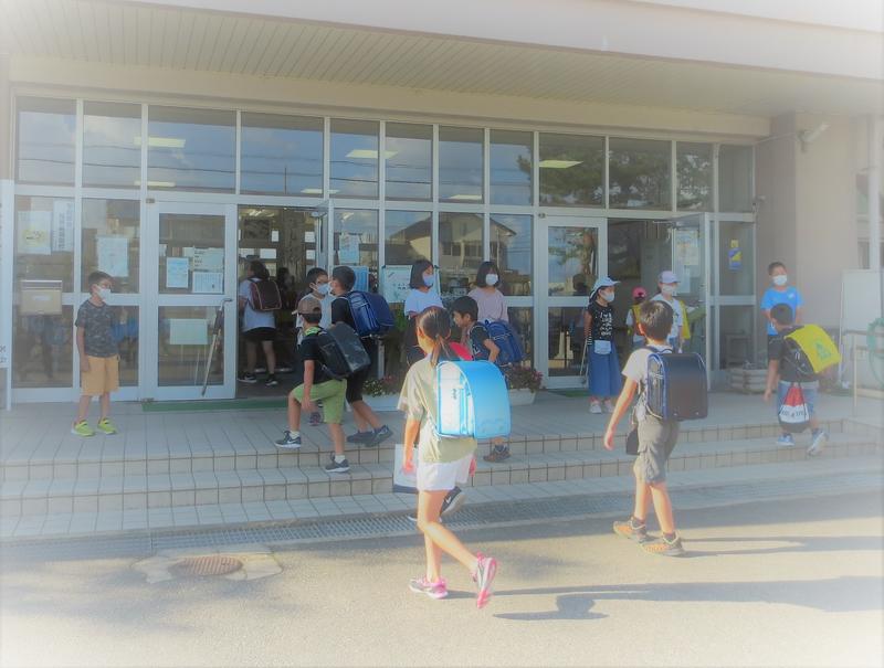 各町の集団登校班が日替わりで、学校の児童玄関前に立っています。