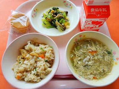 深川めし(さくら麦ごはん) 牛乳 小松菜のソテー 柳川風かきたま汁 今川焼 |