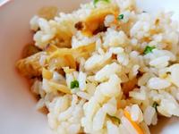調理員さんがあさりをふっくらと酒蒸しした後に、うすあげやにんじん、小口ねぎなどと炊き上げて