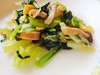 小松菜は一度ゆでて、水で冷やしておきます。そうすると、緑色が鮮やかに仕上がります。