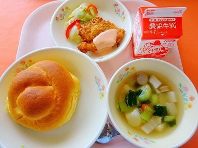 キャロットパン 牛乳 チキンカツ オーロラソース 野菜ソテー コンソメスープ |