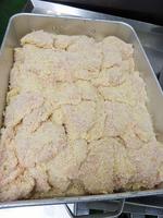パン粉付けされた鶏肉。 揚げる前なのにきれいに並べられているので 揚げる調理員さんが助かります! |