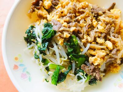 ビビンバ(麦ごはん減) ・肉と卵のナムル ・もやしのナムル わかめスープ |