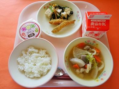 ごはん(減) 牛乳 釜揚げいりこフライ(1~3年生は1本) まんばのけんちゃん しっぽくうどん 和三盆入りプリン(豆乳)) |