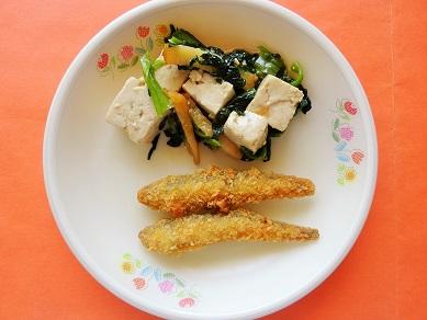 さつまあげと豆腐、小松菜を炒めて作ります。 甘めの味つけです。 仕上げに入れたごま油がいい香りです! |