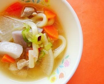 いりこ(煮干)のだしに、大根や里芋、にんじん、油揚げ、鶏肉、ごぼう、しいたけなどを