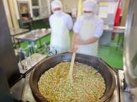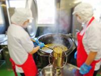 うどんの配食はむずかしいのです。 麺用の杓子や汁用の杓子を 使いながら工夫して 配食してくれました。 |