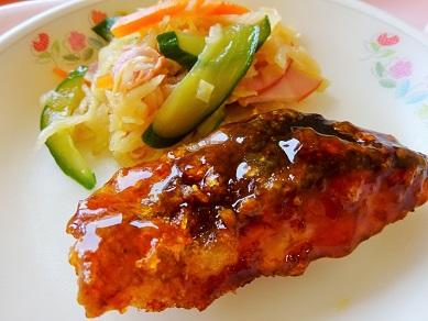 給食では揚げた鮭に、手作りの色付けのタレをたっぷりかけました。