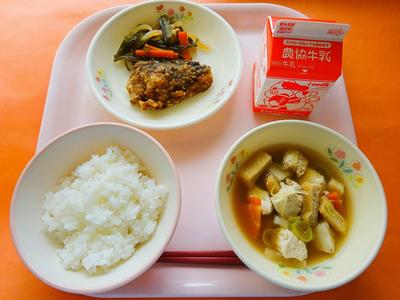 ごはん 牛乳 さばのマスタードソース 茎わかめの炒め煮 かみなり汁 |