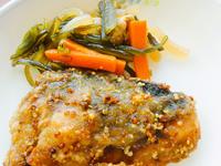 さばのマスタードソースは ウスターソース、レモン汁、粒マスタード 砂糖、オリーブ油を加熱して作ります。 |