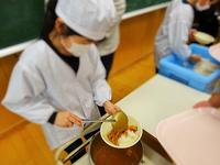 1年生の給食当番さん。 ごはんも見えるようにルウを 盛りつけてくれました。 |