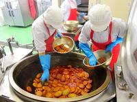 熱さに耐え、きれいに並べてくれたハンバーグの上から、 釜に残ったソースを再加熱して、 でんぷんでとろみをつけてソースを仕上げます。 できあがったソースをハンバーグの上にかけて、 各クラスのワゴン車へと運びます。 |