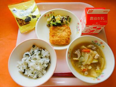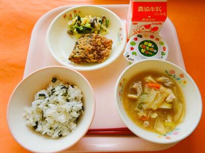 わかめごはん 牛乳 ★さばの香味揚げ(セレクト) ・タラフライ(セレクト) 小松菜のソテー うち豆入りごま汁 ★野菜と果物のゼリー(セレクト) ・卯の花揚げ(セレクト)