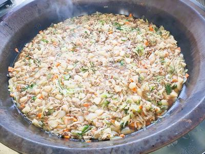 下煮した豚肉とたっぷりのねぎを入れて仕上げます。