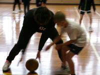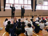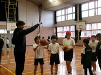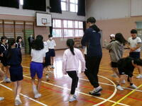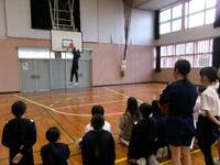石川県のプロバスケットボールチーム金沢武士団(サムライズ)からお二人、バスケットを教えに来てくださいました。当初、6年生のバスケットボール交流会の前に予定していましたが、学年閉鎖があったため、今日に延期されていました。ドリブルやシュートを教えてもらった練習の後、「サムライズのお二人+5・6年担任チーム」VS「各学年10人程チーム」で試合をしました。現役のプロ選手の放つダンクシュートにみんな大興奮でした。