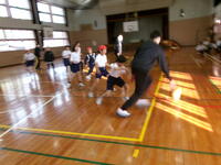 小松特別支援学校のお友達と体育で交流しました。自己紹介の後、みんなで、たからはこびおに、的あてボールけり、シャトルボールけりをやりました。たからはこびおには、鬼の関所を突破して、宝を円の中に運びます。1年生がつけた別名は「おにのすみか」です。鬼にタッチされないように上手にすり抜けなければいけません。大盛りあがりでした。