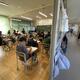 1年生初めての給食。うれしい顔とおいしい顔でいっぱいです。