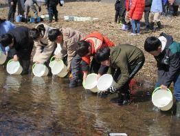 12月にヤマメの発眼卵を預かり、孵化から稚魚になるまで育ててきたヤマメを川に放流しました。3年生は毎日交代で、水温の管理、餌やり、水替えなどに携わってきました。放流会は、中海小の3年生と一緒に行いました。大きなサクラマスになって、川に戻ってきてくれることを願いながら、ヤマメの稚魚とお別れしました。